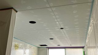 本日より岐阜市O小学校体育館トイレ箇所新設塗装工事入りました。初日は天井パテ処理・パテ2回目作業及び養生作業進めていきました。