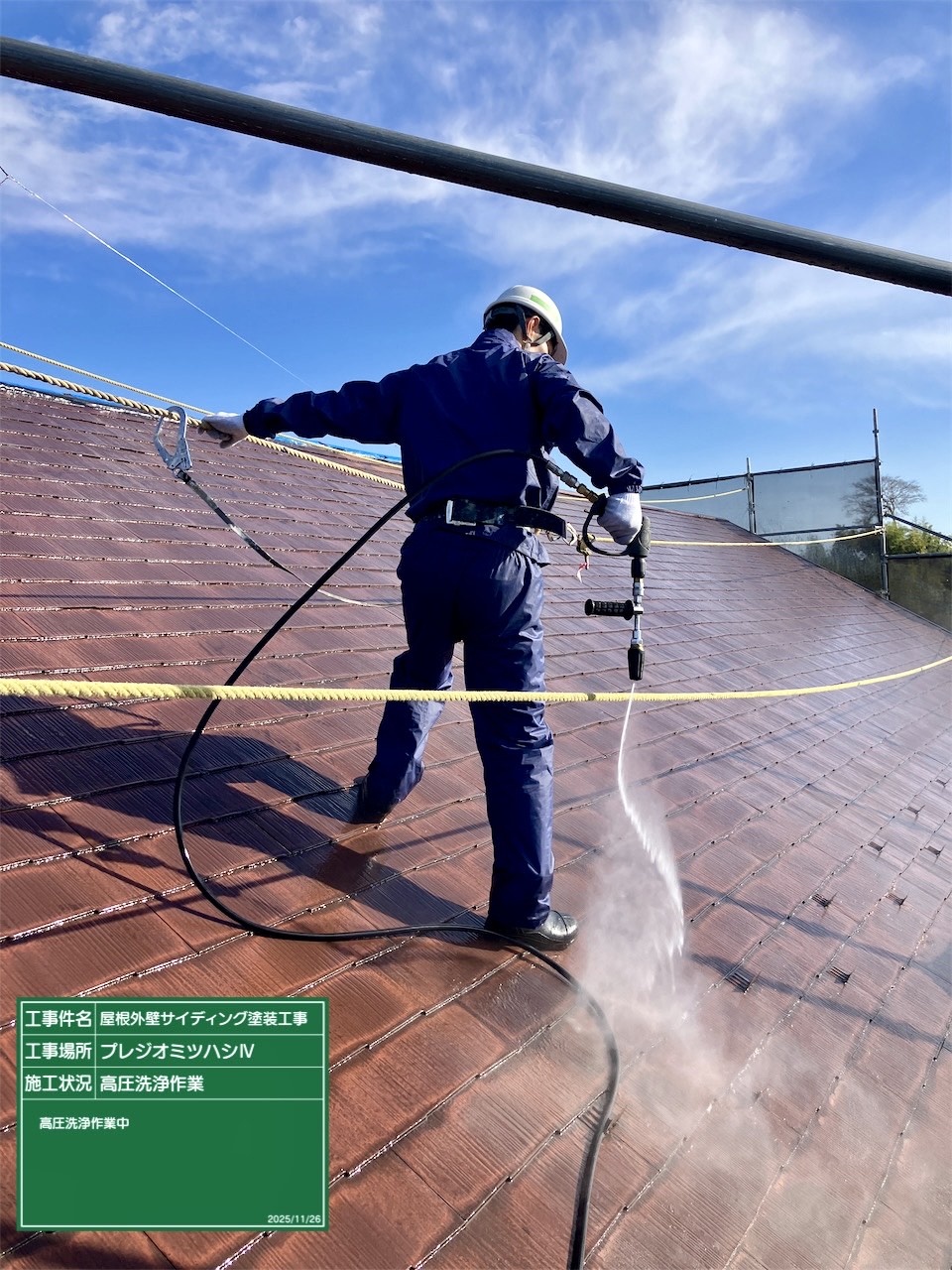 本日は二棟目の高圧洗浄作業進めていきました。無事完了致しました。四棟の内の残り二棟は来年施工になります。