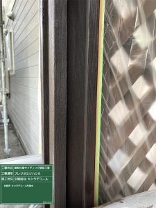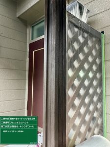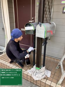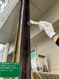午後より養生作業が終わり時間がありましたので玄関前柱のキシラデコール作業進めました。