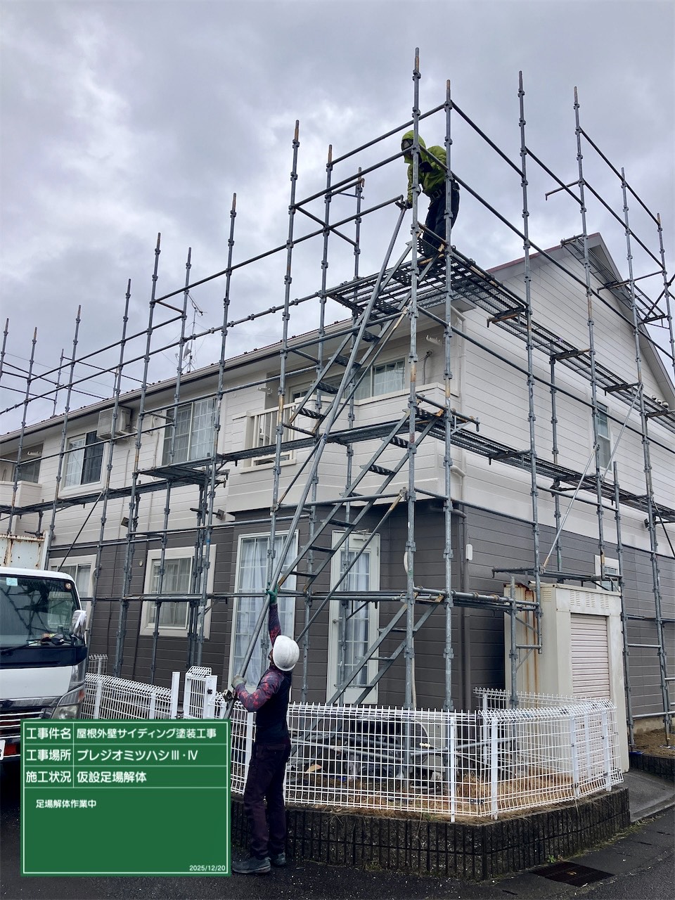 昨日はアパート4棟塗装工事の内の2棟の足場解体作業進めていきました。来年3月残りの2棟も始まります。安全作業で塗装工事2棟進めていきます。