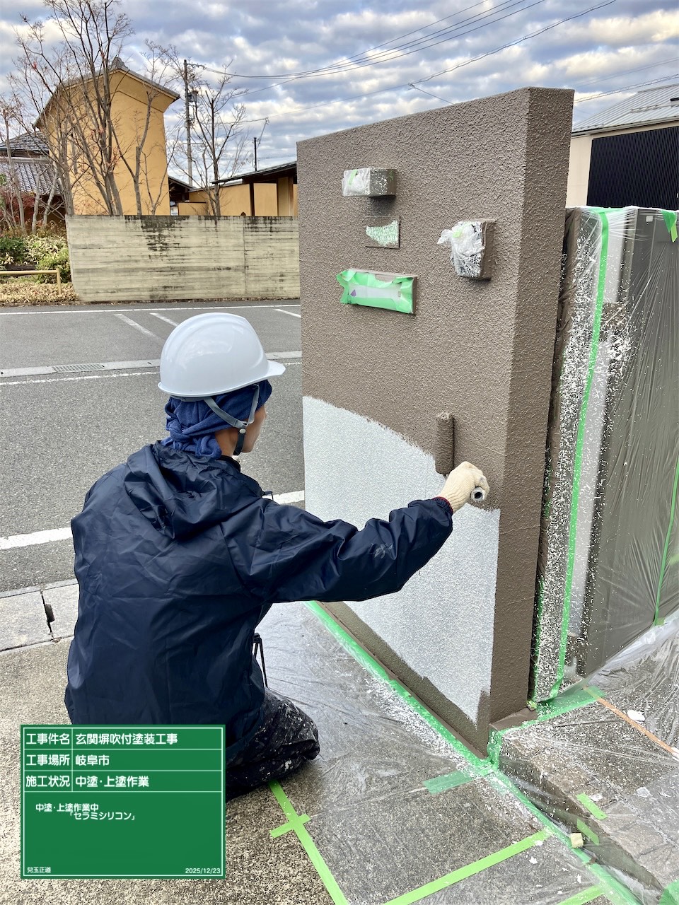本日は昨日に引き続き門壁吹付後の上塗作業進めていきました。