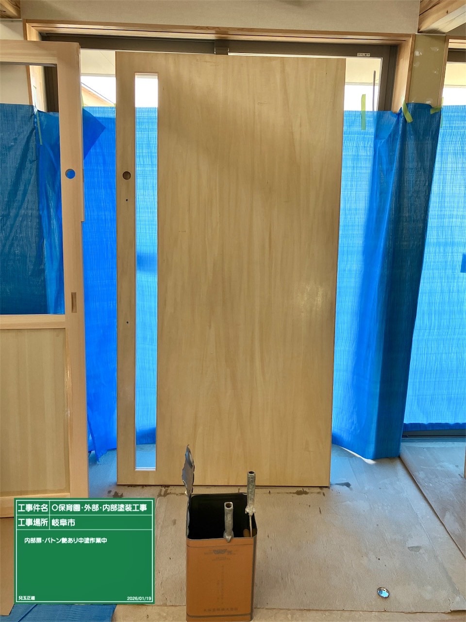 本日より保育園内部木部扉等の塗装工事始まりました。ペーパーを当て先に下塗り艶ありバトンクリヤーを塗装し仕上げにバトン艶消しを塗装します。
