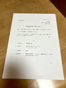 本日は2日より始まる屋根外壁塗装工事に伴い居住者様・近隣様の御挨拶周りです。2日よりよろしくお願い致します。