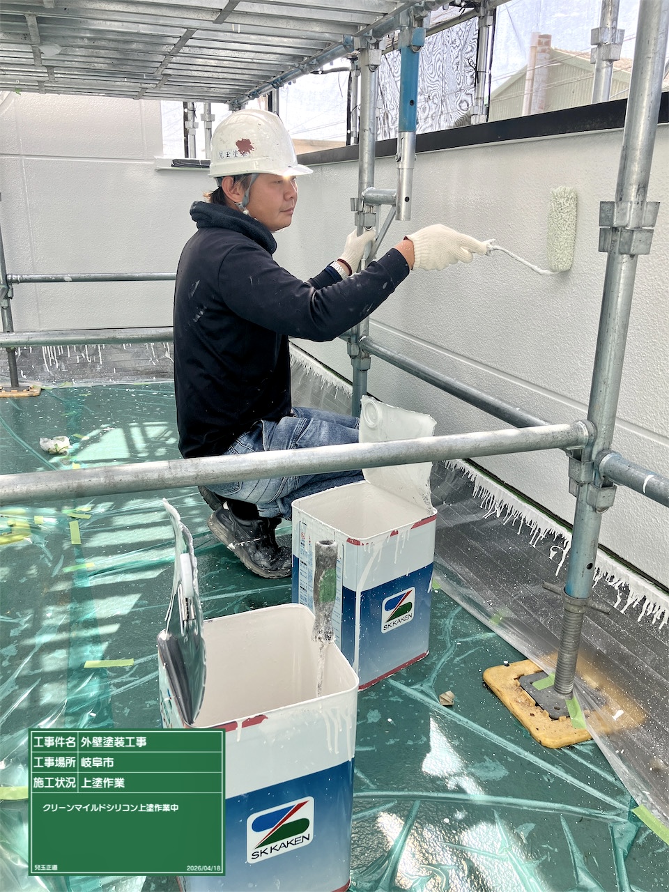 外壁上塗作業進めていきました。来週からは役物塗装工事を進めていきます。新人のT君です。