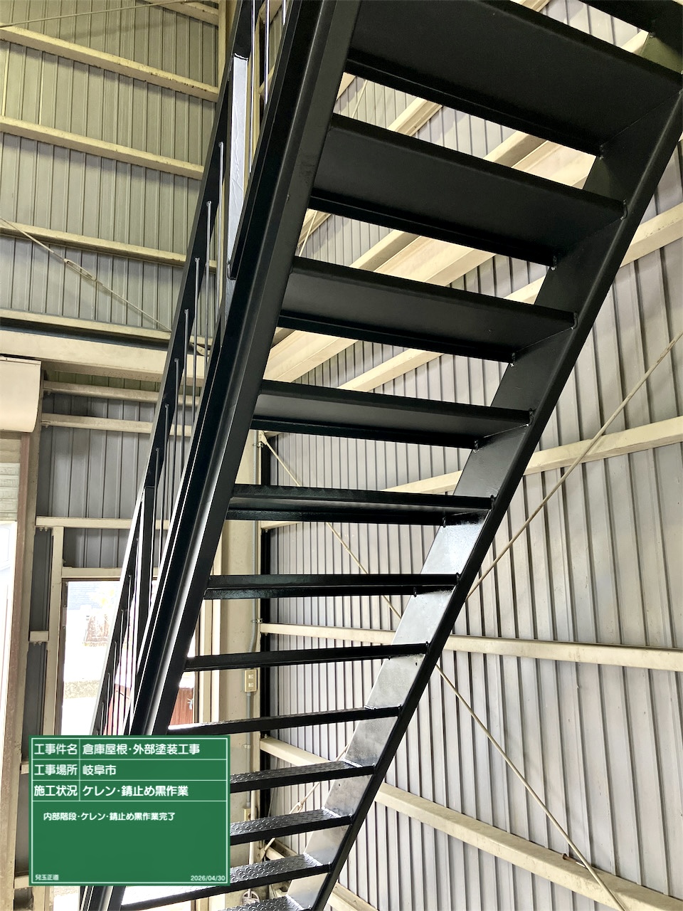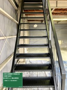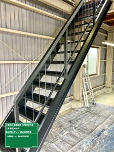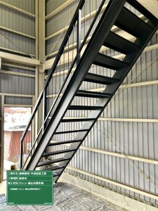手摺り・階段箇所錆止め作業完了です。連休明けにセミフロンフッ素中塗・上塗作業進めていきます。