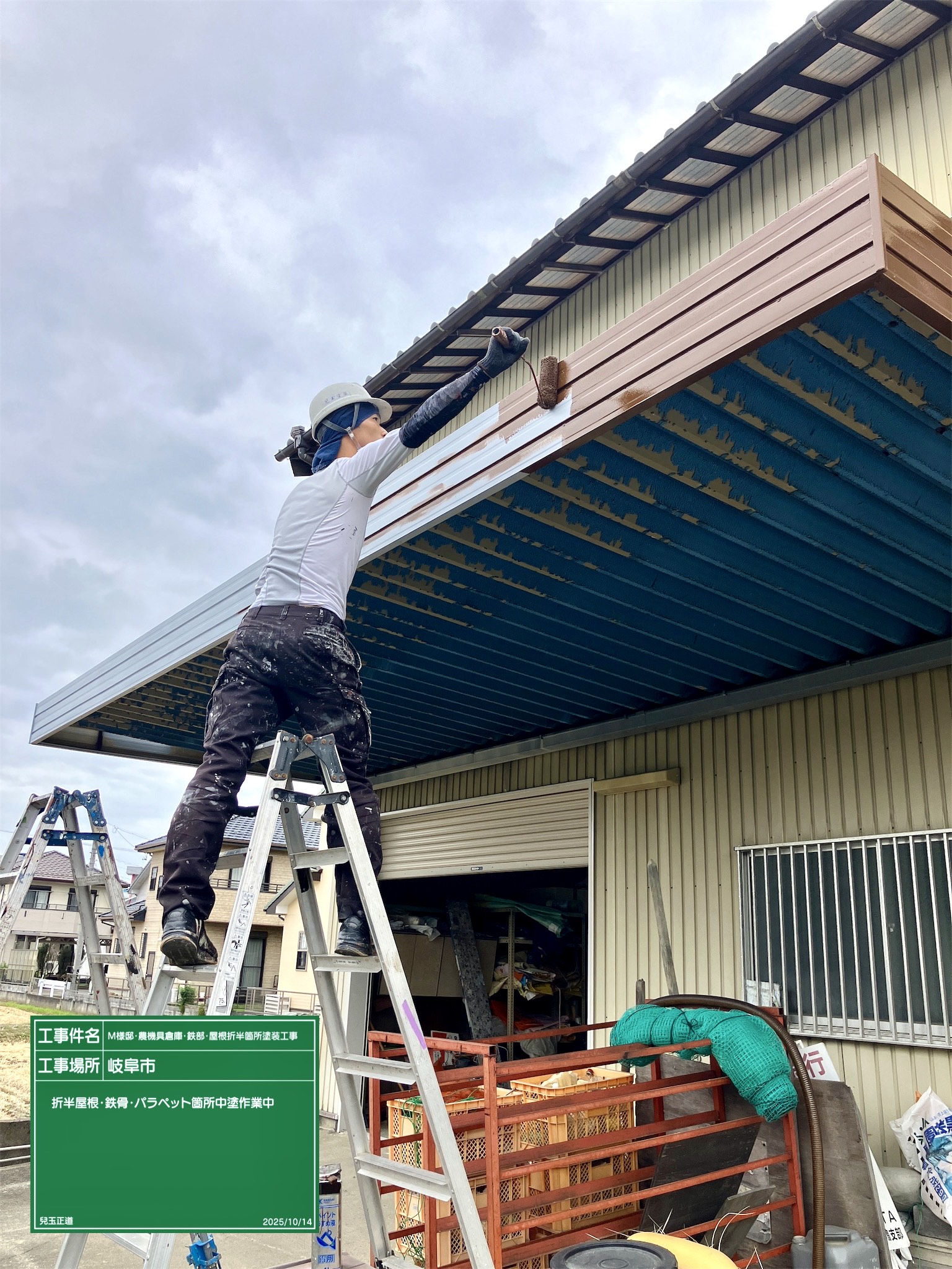 本日は折半屋根・パラペット箇所・室内扉の中塗をおこないましたが雨で作業途中中止になりました。明日は引き続きの作業になります。