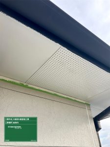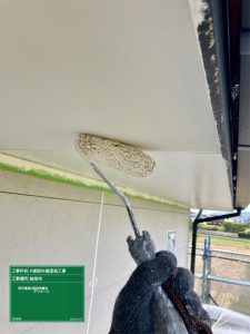 軒天塗装中塗・上塗・高級塗剤ケンエース作業です。2回塗りにて綺麗に収まりました。