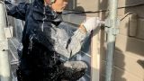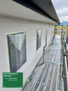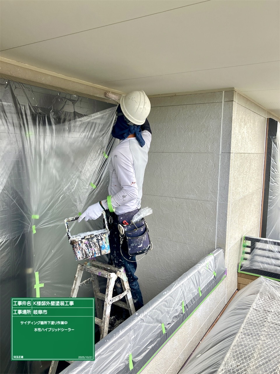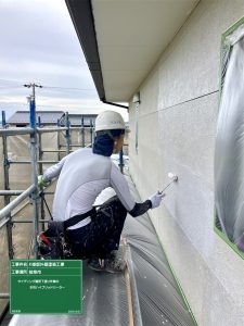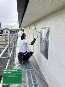本日軒天塗装が完了し昼前から外壁サイディング箇所の下塗りシーラー作業進めていきました。