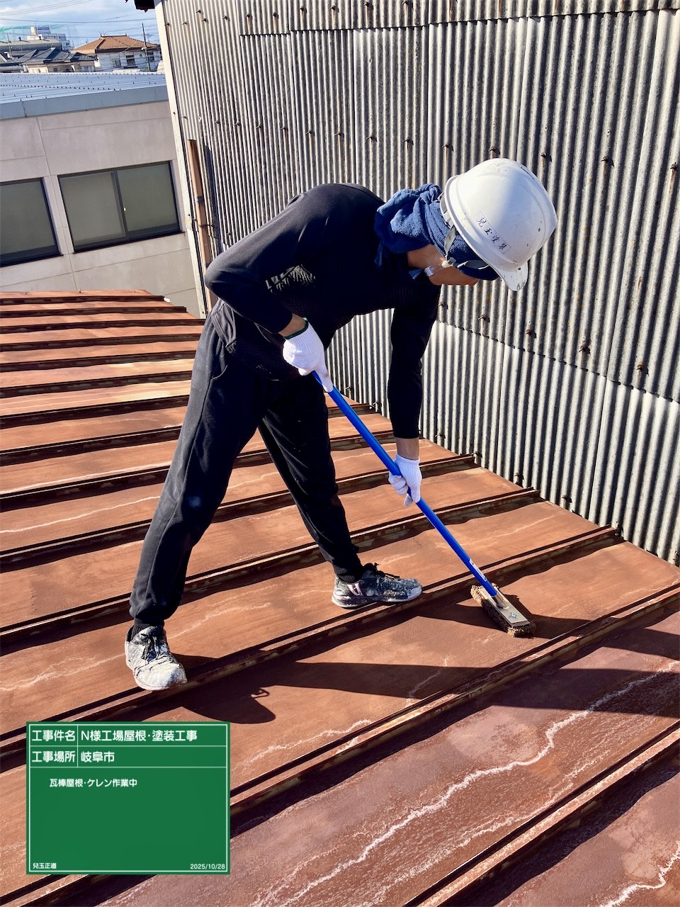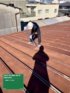 本日は工務店様依頼の工場屋根の塗装工事。初日ケレン・錆止め作業をおこない。午後より錆止め作業入りました。
